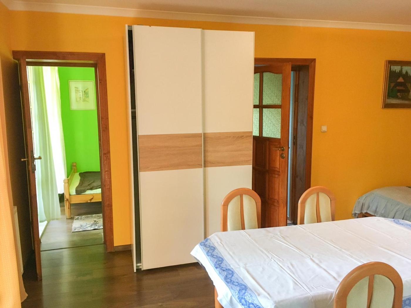 Pokój rodzinny z widokiem na ogród. Guests can make meals in the fully equipped kitchenette that features a refrigerator, kitchenware and an electric kettle. The family room offers a dining area, a wardrobe, a balcony with garden views as well as a private bathroom featuring a bath. The unit offers 3 beds. Rodzinny - 5 osobowy. Powierzchnia pokoju ok.: 20 mkw. ;
