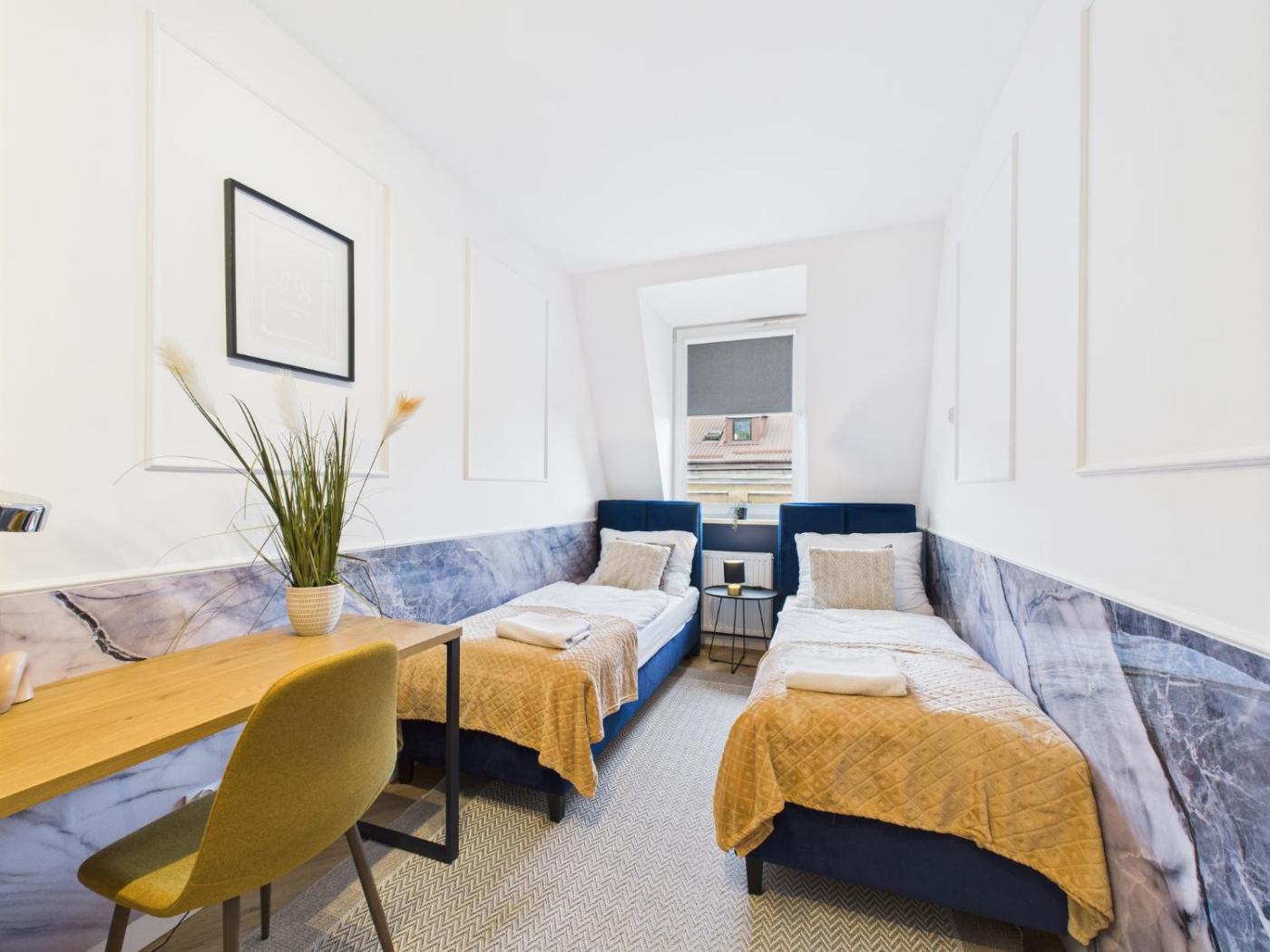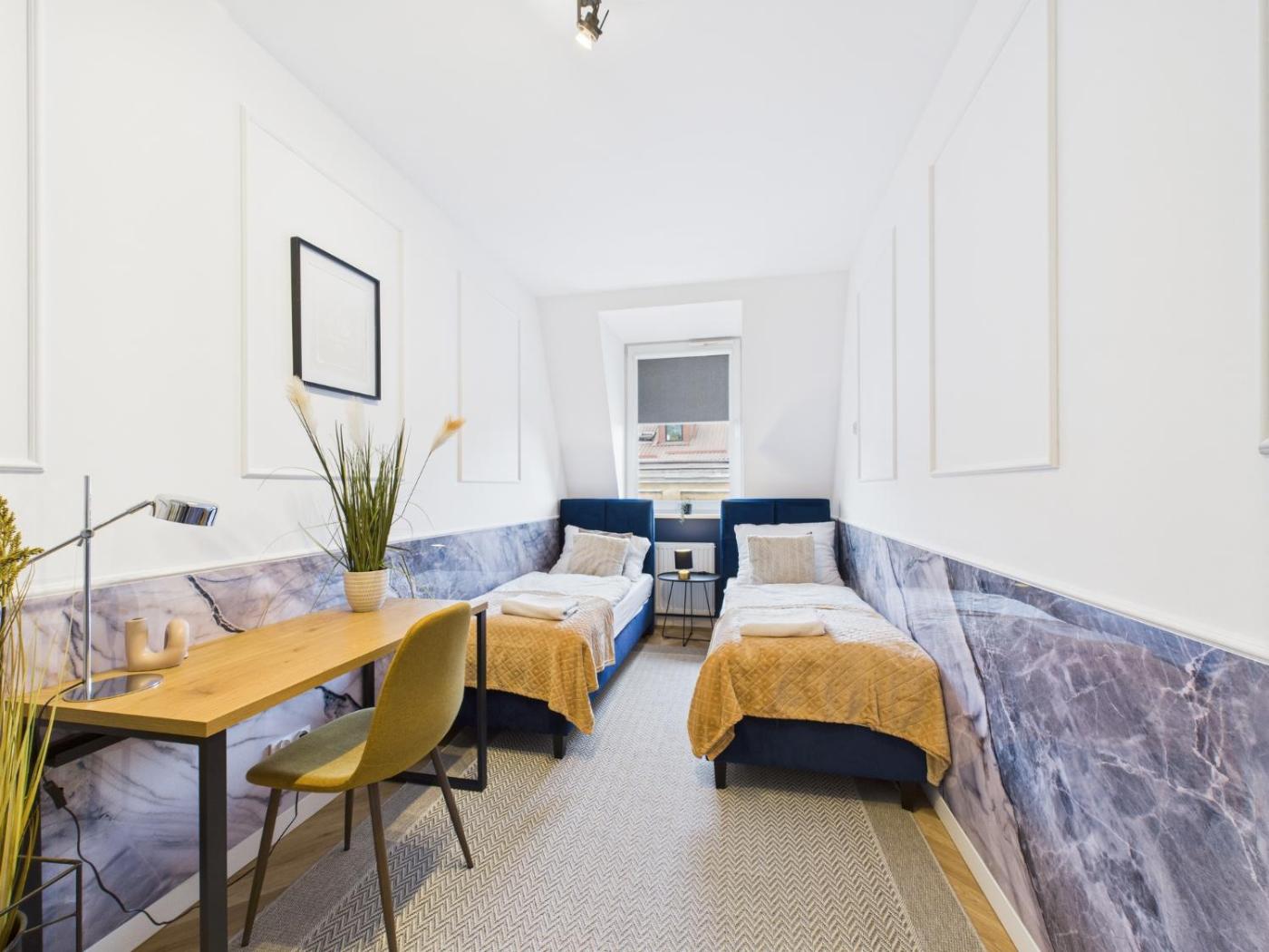 Apartament. Boasting a private entrance, this spacious apartment also features 4 bedrooms, a seating area and 2 bathrooms with a bath and a shower. Guests can make meals in the kitchen that has a stovetop, a refrigerator, a dishwasher and an oven. The apartment features soundproof walls, a tea and coffee maker, a dining area, a flat-screen TV with cable channels, as well as city views. The unit has 7 beds. Apartament - 8 osobowy. Powierzchnia pokoju ok.: 102 mkw.
