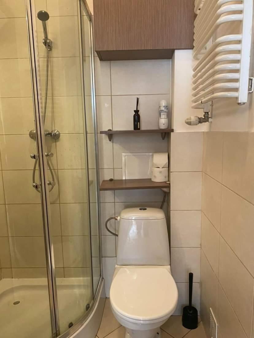 Apartament z prysznicem. This apartment is comprised of 1 living room, 1 separate bedroom and 1 bathroom with a shower and a hairdryer. Guests can make meals in the kitchen that comes with a stovetop, a refrigerator, kitchenware and a microwave. This apartment features soundproof walls, flat-screen TV with cable channels, city views, as well as chocolate for guests. The unit offers 3 beds. Apartament - 5 osobowy. Powierzchnia pokoju ok.: 43 mkw.